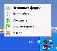 «Вкл/Выкл интернет» – включает или выключает интернет. Внешний вид иконки в трее изменяется соответственно текущему состоянию подключения: