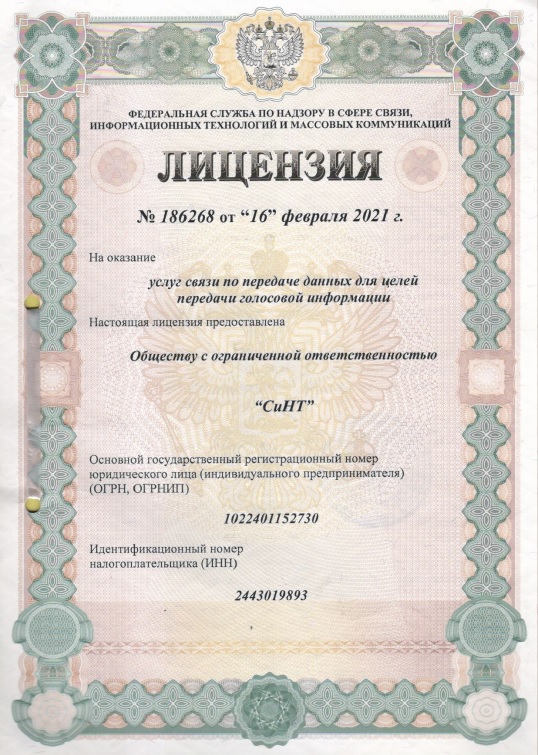 — лицензия № 186268 на услуги связи по передаче данных для целей передачи голосовой информации.
